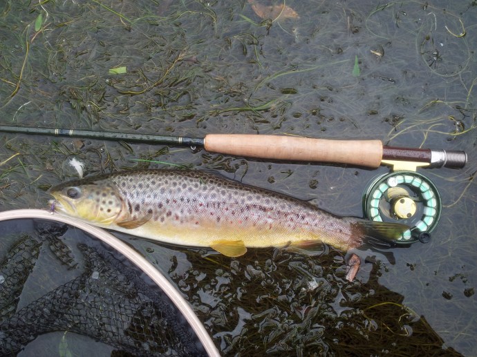 The weather turned around again quickly (if you don’t like the weather in Debyshire stand still for twenty minutes and wait for it to change) and all of a sudden we were bathed in the kind of warm but humid heat that only seems to occur after a storm. I found a riffle further upstream too hard to resist and climbed in to terrorise a few grayling but also picking off a good trout which was taking small olives as they emerged.