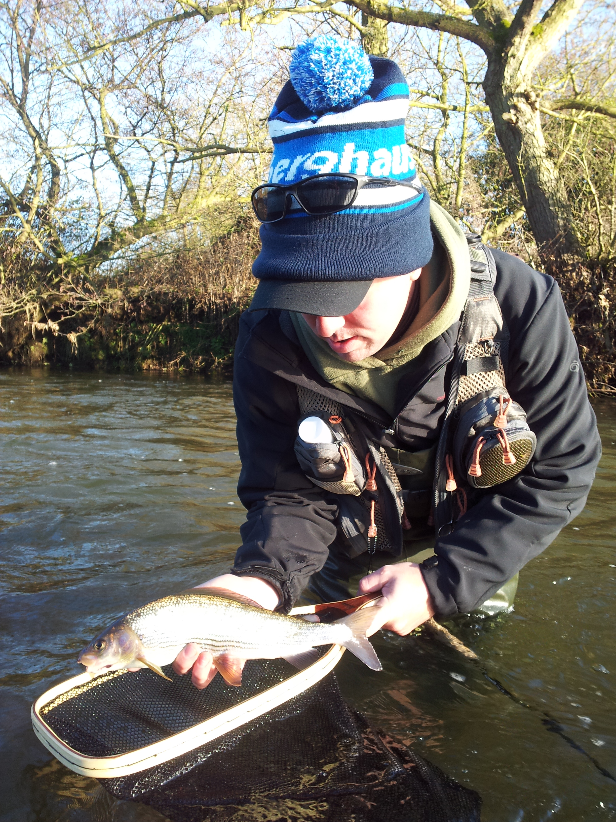 This was followed by grayling numbers two, three and an awful lot more but while the numbers were good I really hoped Jason would hook something that would test his mettle a little more. I watched him strike a fish and could tell from the look on his face that this fish felt a little different. The Sage ESN hooped right over and he was running downstream towards me quickly. “It feels like a submarine” was how he described the fish that we still hadn’t seen after five minutes of battle but I had a feeling that it would be one of the remaining rogue rainbows stocked by another club in April. Out of season but not unwelcome, by now they’re very settled in and they really pull back. The fish was played expertly by a man who has played fish expertly for a very long time though the netting was made tough as the fish didn’t fit in Jasons little wooden pan net. A fish of around two pounds made a better account of itself than a similar stillwater fish ever could and it went back strongly after a couple of pictures. Jason had been on the river an hour and had banked the biggest grayling and rainbow trout of his life.