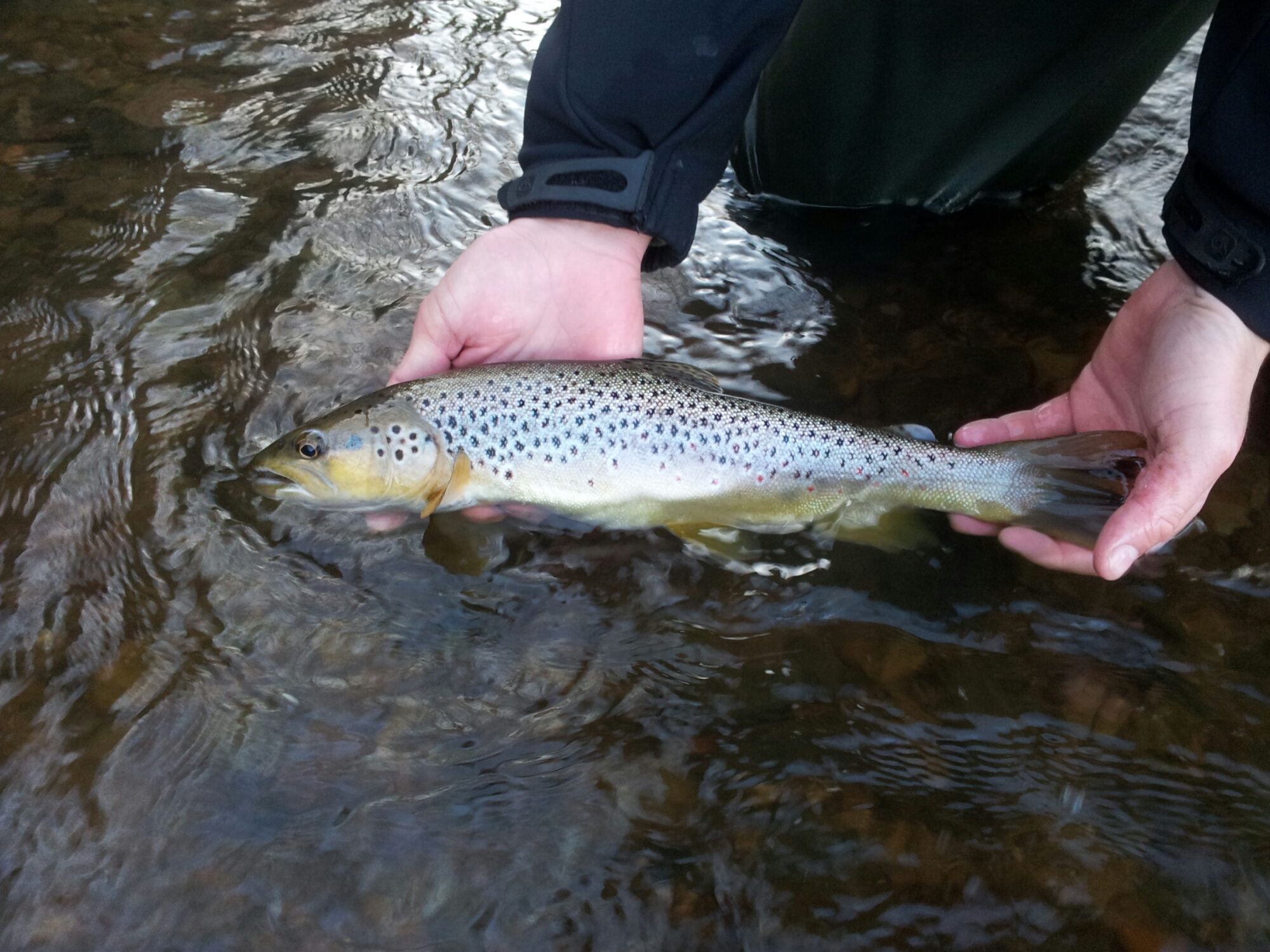 I fished throughout most of the day, following Jason up the likely looking runs offering advice and insults as required. I think I caught plenty of fish but to be honest I can’t really remember any of them, even while I was landing a fish I was conscious of what was happening a little further upstream. We changed flies an awful lot as should always be the case and discussed the reasons behind any changes that were made.
