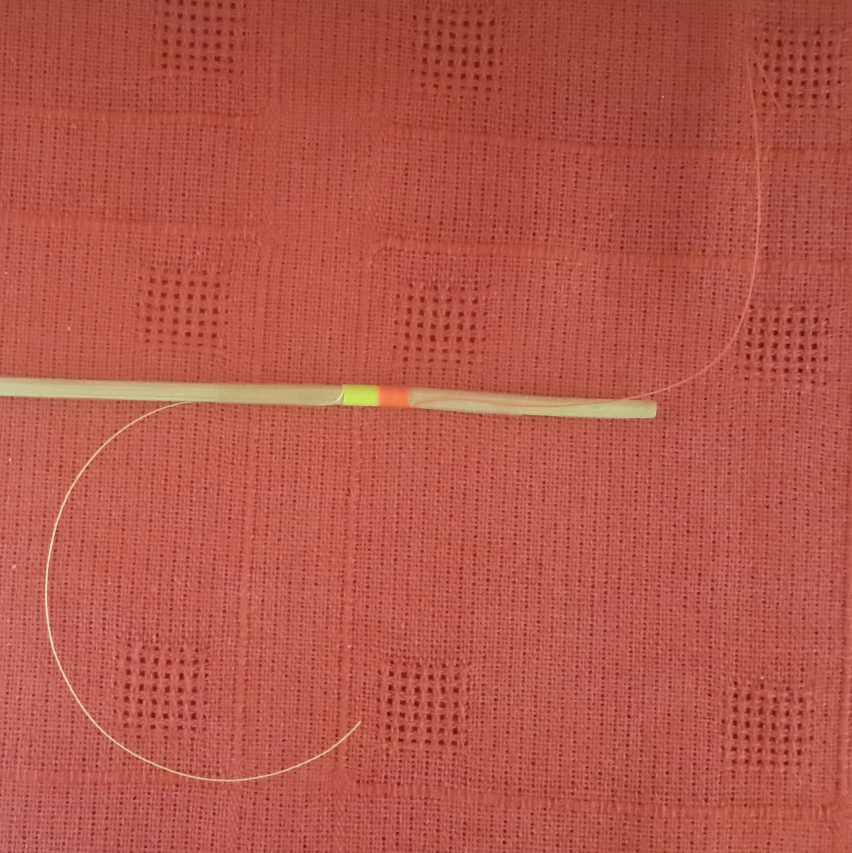 You’ll notice that the Hanak Bi-Colour Indicator line is indeed two colours, maybe even three depending on which you buy. Cut a 50 cm length from the spool trying to ensure that the colour change or changes are in the middle of the length of line you have cut away. The centre of this section will be the centre of the coil of the finished indicator and having two colours gives the angler greater visibility of the indicator on the water.