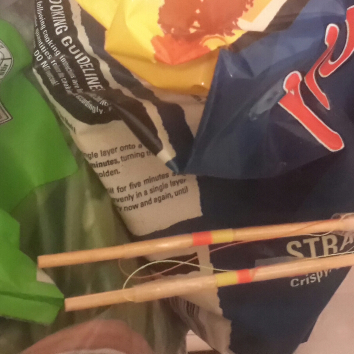Take the skewers straight from the pan and in to a freezer, ensuring that the coils arent in contact with anything in there and that the tags are making minimal contact. The cold of the freezer will solidify the coiled form of the hot, soft monofilament. I tend to leave mine in there overnight but this may be overkill. A few hours at the very least is required for the coils to fully take their new shape.