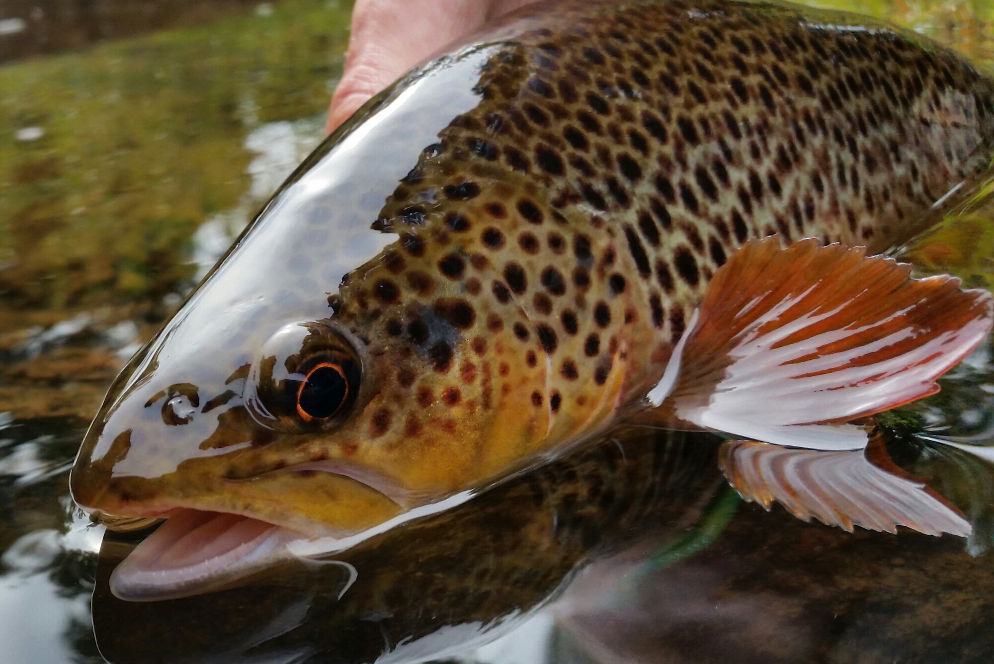 Further up stream I found a deep pool to the side of the main drag which was fed over a lip of bedrock, the tumbling water again seemed to be freshening this area of the river. After upping the size of the flies (but sticking with the same patterns) I hooked a corking 20″ fish which I initially thought was even bigger – the flank looked enormous as it tried to thrash the hook from its bottom lip. I must have looked an idiot as I inadvertently beached the fish on some pebbles in the mid – stream but couldn’t figure out how to get him in to the net. Instinctively I trapped him like you might a spider with a drinks glass – one of those “I hope nobody saw that” moments.